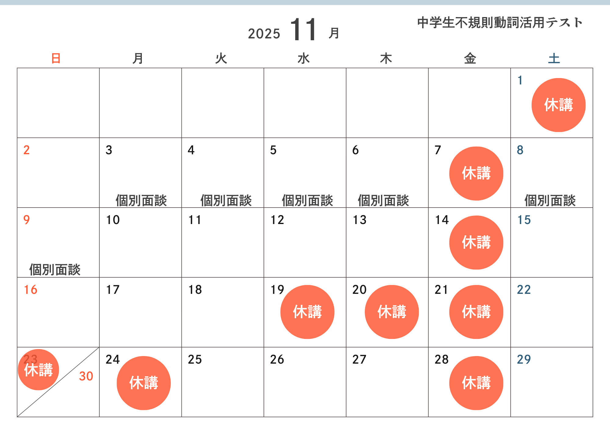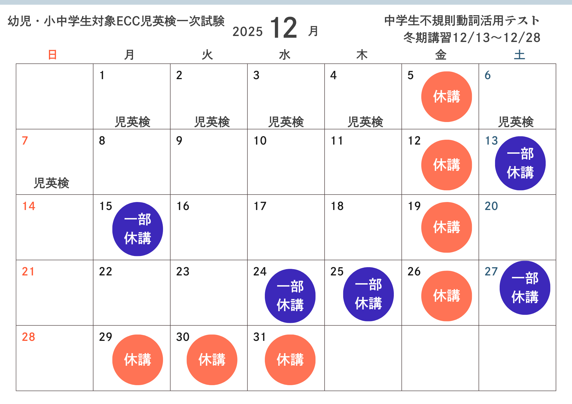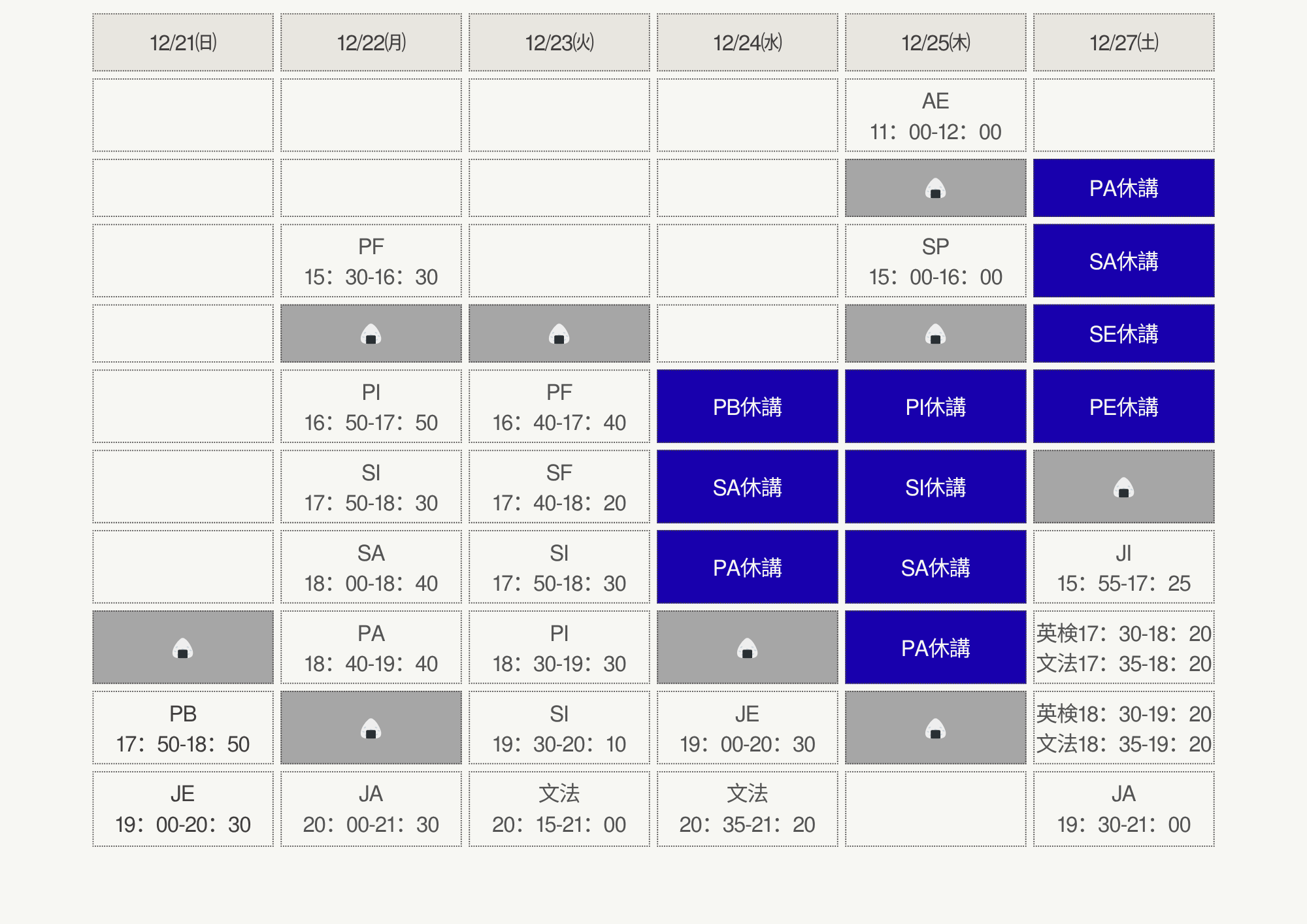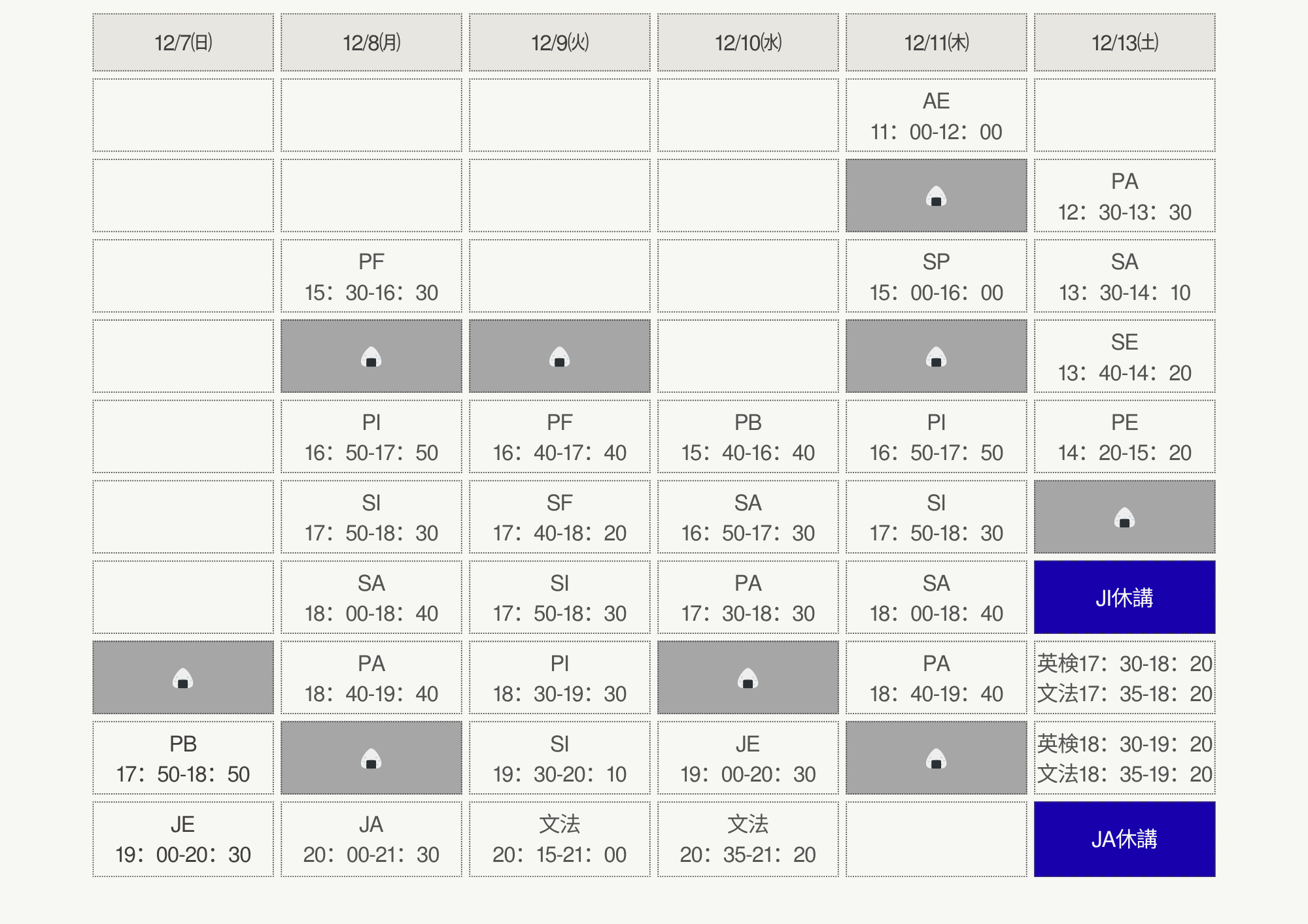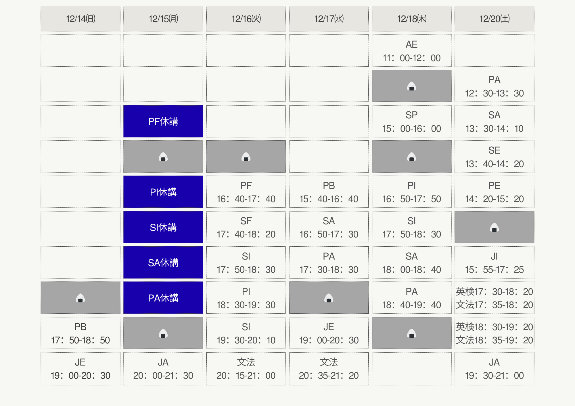 12月2,3,4週目の一部休講となるクラスはこちらをご確認ください。