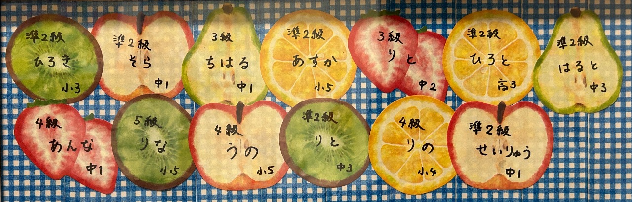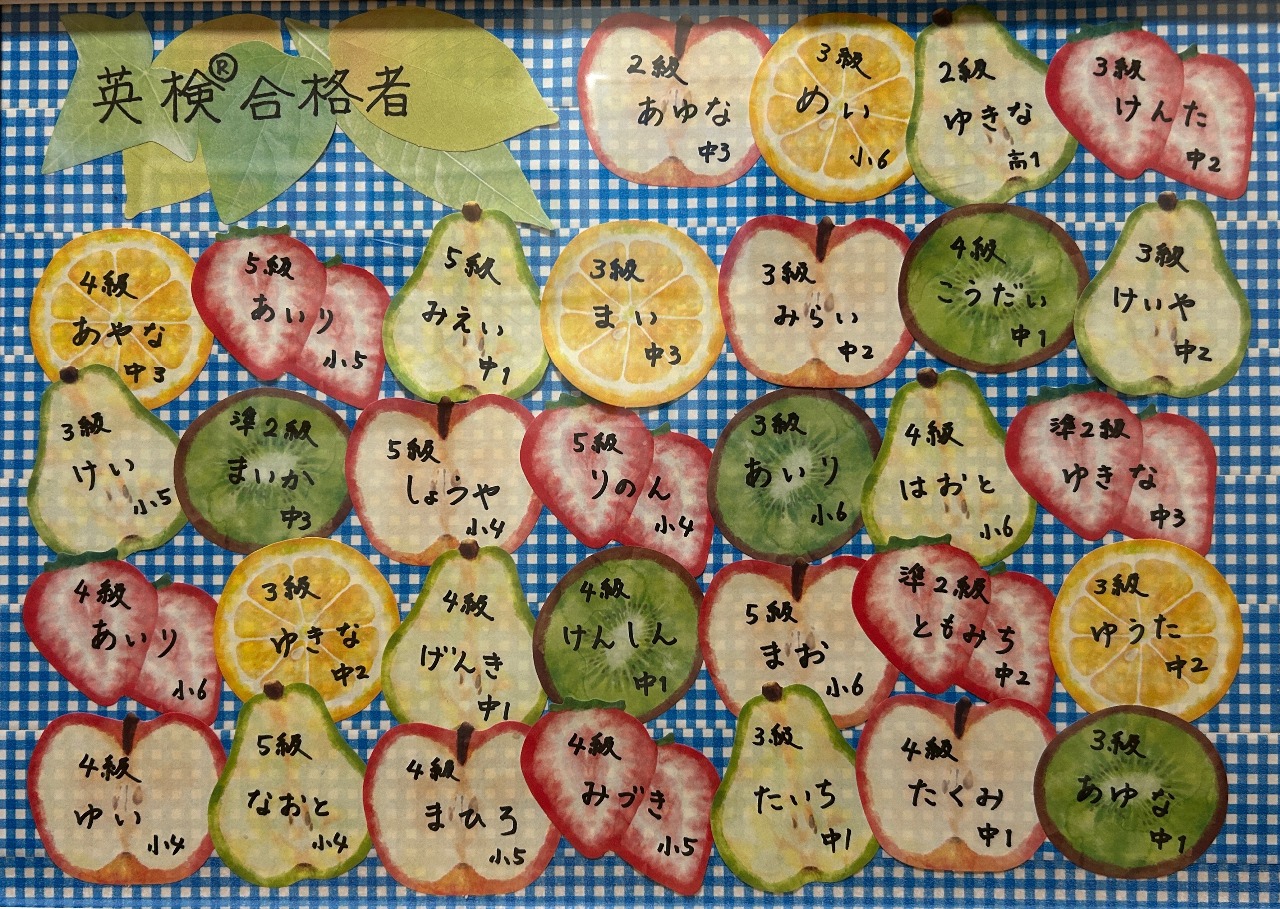 英検®の合格級と学年を貼りだしています。もし「合格していたのに言っていなかった!」という生徒さんがいらっしゃいましたらいつでもお知らせください。